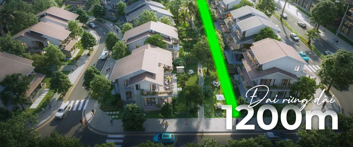 - Tổng thể: Các căn nhà thấp tầng, hòa mình trong mật độ cây xanh dày đặc, tạo nên cảnh quan tự nhiên, đồng nhất và thư thái.